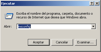 Una vez arrancado el ordenador en modo seguro, hacemos click en el botón Inicio y luego en la opción Ejecutar. En el pequeño cuadro de diálogo que saldrá escribimos "msconfig" y pulsamos Aceptar.
